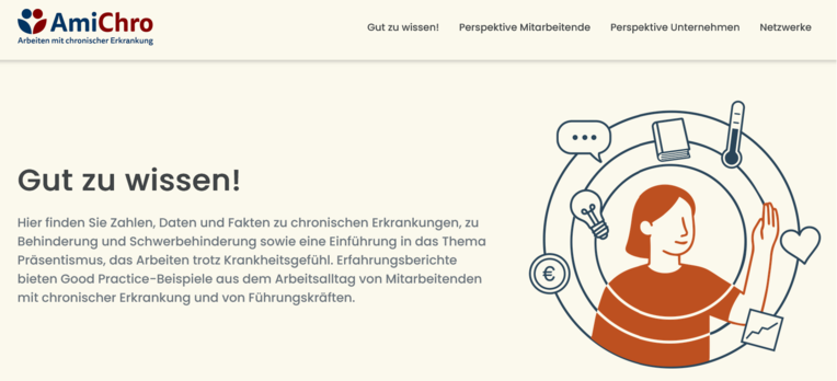 Auf der Webseite https://arbeiten-jaodernein.de finden sowohl Mitarbeitende mit chronischen Erkrankungen als auch Führungskräfte, HR, betriebliche Interessenvertretungen und Kolleg*innen Antworten und Hilfen rund um das Arbeiten mit chronischen Erkrankungen.