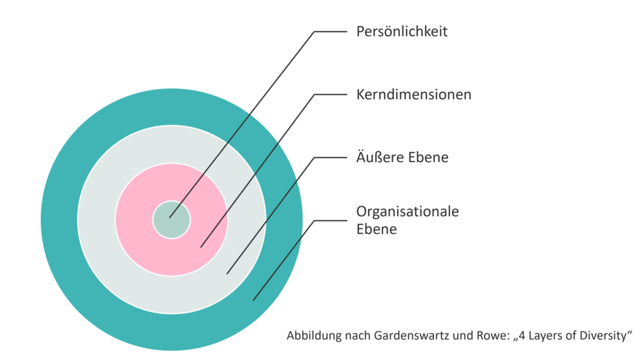Um ein Verständnis davon zu haben, welche Merkmale relevant sein können, hilft das "Modell der Vielfalt". Es geht auf die US-Amerikanerinnen Lee Gardenswartz und Anita Rowe zurück und beschreibt die Vielfalt von Personen mit unterschiedlichen Merkmalen. Diese gliedern sich in mehrere Dimensionen, die hier in Ringen dargestellt sind. Je weiter ein Merkmal vom Kern des Modells entfernt ist, desto flexibler und veränderbarer ist es. Dies spielt jedoch für den Wert der Dimension keine Rolle - jede ist genauso wichtig wie die andere.